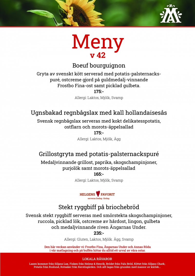 LOKALA RÅVAROR Några exempel: Siljans Lax, Falu Bröd, Siljans Chark, Roslunds Poratis, Rotsaker från Kerstisgården, LissEllas, Helen & Henrik fiskdelikatesser, Catarinas Sprätthönseri, Pollacksgården