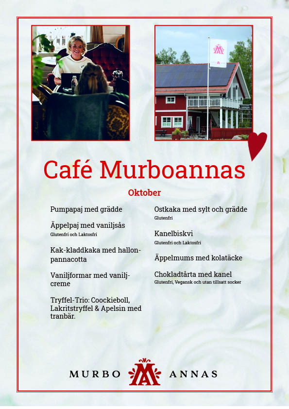 Varje månad presenterar Erika en ny smaskig meny. Mycket är glutenfritt, laktosfritt. Vi har också veganskt och fika utan tillsatt socker.